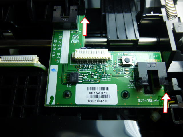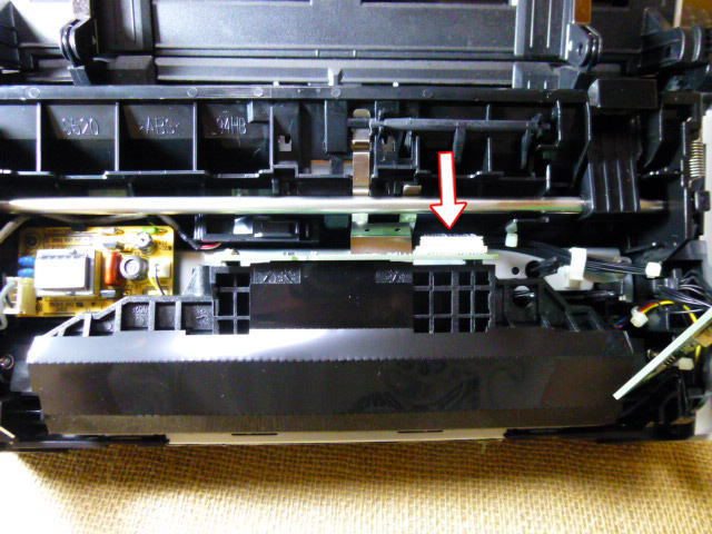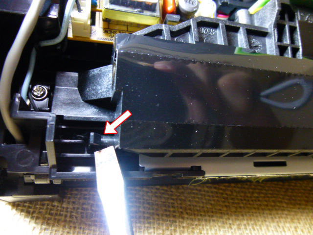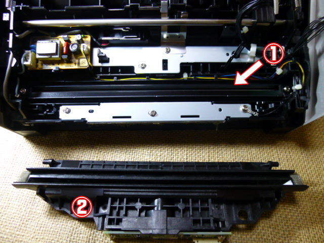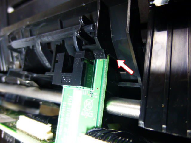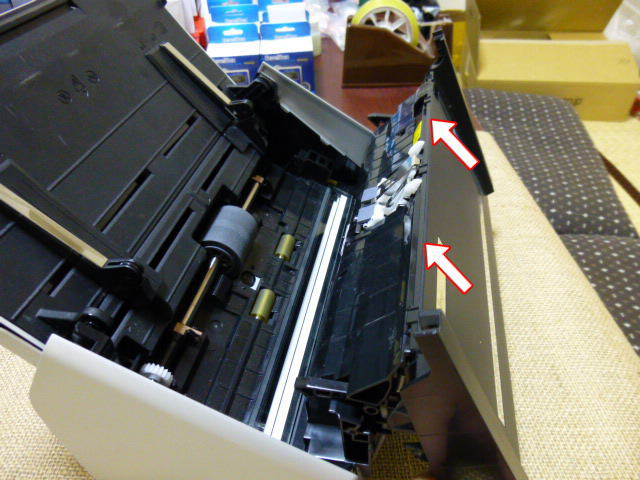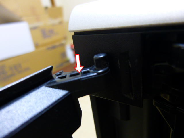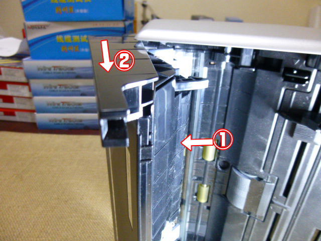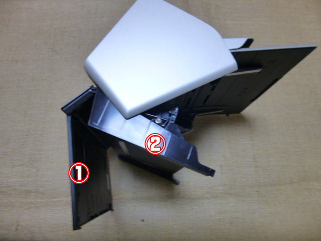 前の段落3枚目写真の①の用紙受けをまず外します。左右にプラスチックの止めがあるだけですので、写真1のように矢印の方向に慎重にゆっくり押し、プラスチックのポッチを外します。分離完了です。