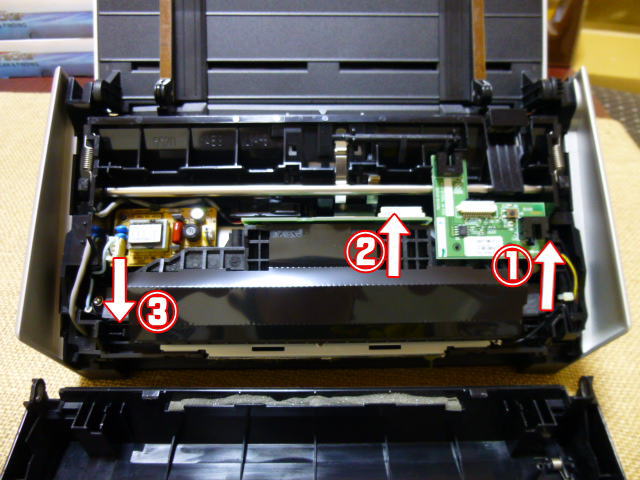 1枚目の写真で全体像を説明しますと、黒いフィルムのついた部分がいわゆるオプトユニットと呼ばれる受光レンズユニットで、これがスキャンガラスの裏から密着しているという状態です。これを取り外して、スキャンガラスの裏側と、オプトユニット部分をエアダスターを利用して清掃するのが分解の趣旨です。取り外しまでは3ポイント。①基盤を横によけて、③のカプラを外し、③ツメを外すと取り外せます。