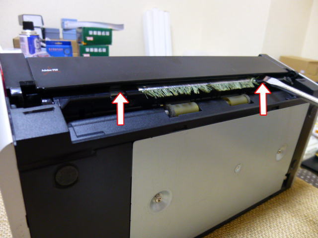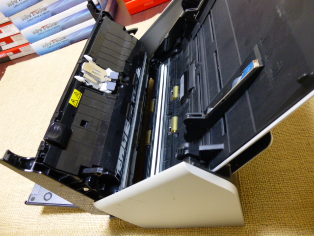 スキャンスナップの前部のガラスの清掃は2枚目の写真のように本体を開いてアルコールでノリやホコリを落とすわけですが、