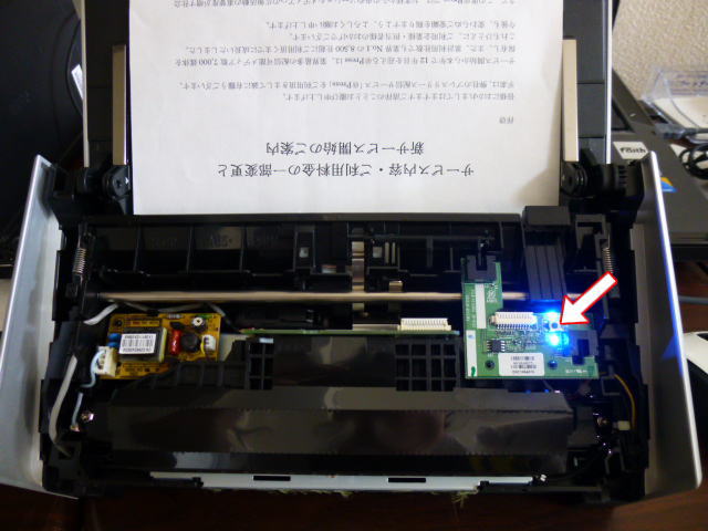 実は秘策があるのですが、清掃後は、オプトユニットと基盤を取り付けた状態であれば、カバーを外したままでもスキャンできます。スキャン方法は青色LED部分に小さなボタンがあり、それがスキャンボタンです。全部直した状態で、カプラのつなぎ忘れや掃除不十分で画像が治っていなかったら1からやり直しという悲惨なことになりますからね。