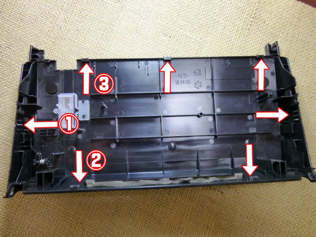 3枚目写真で説明すると、①の部分にネジとツメ。②の部分にツメ。③の部分に引っかけ。がそれぞれ矢印の部分に存在します。つまり、左右のネジを2個外して左右と下部のツメを起こして少しずらした状態で、2枚目写真の②の矢印の方向に押し上げると外せるというわけです。